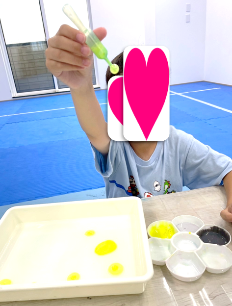 洗濯ノリと水を混ぜた液体の上に、スポイトで上から色水を垂らして、最後に少しだけ混ぜてから白い画用紙を浸すと、様々な模様が画用紙に描かれます🎨