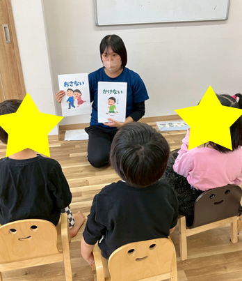 「煙は天井の方に集まるから姿勢を低くして鼻と口をふさいでね」「おさない、かけない、しゃべらない、もどらない、ちかよらない(通称:おかしもち)のルールを覚えておこうね」と伝えると、「押したら怪我しちゃうし、危険だからバツなんだよね」「ハンカチ持ってるからこれ使って口塞ごう!」とたくさん意見も出してくれました😊
