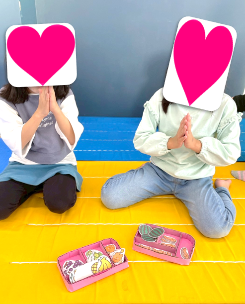 お弁当が完成したら、皆でマットの上で「いただきます👏」をして、ピクニック気分を味わいながら食べました🍙