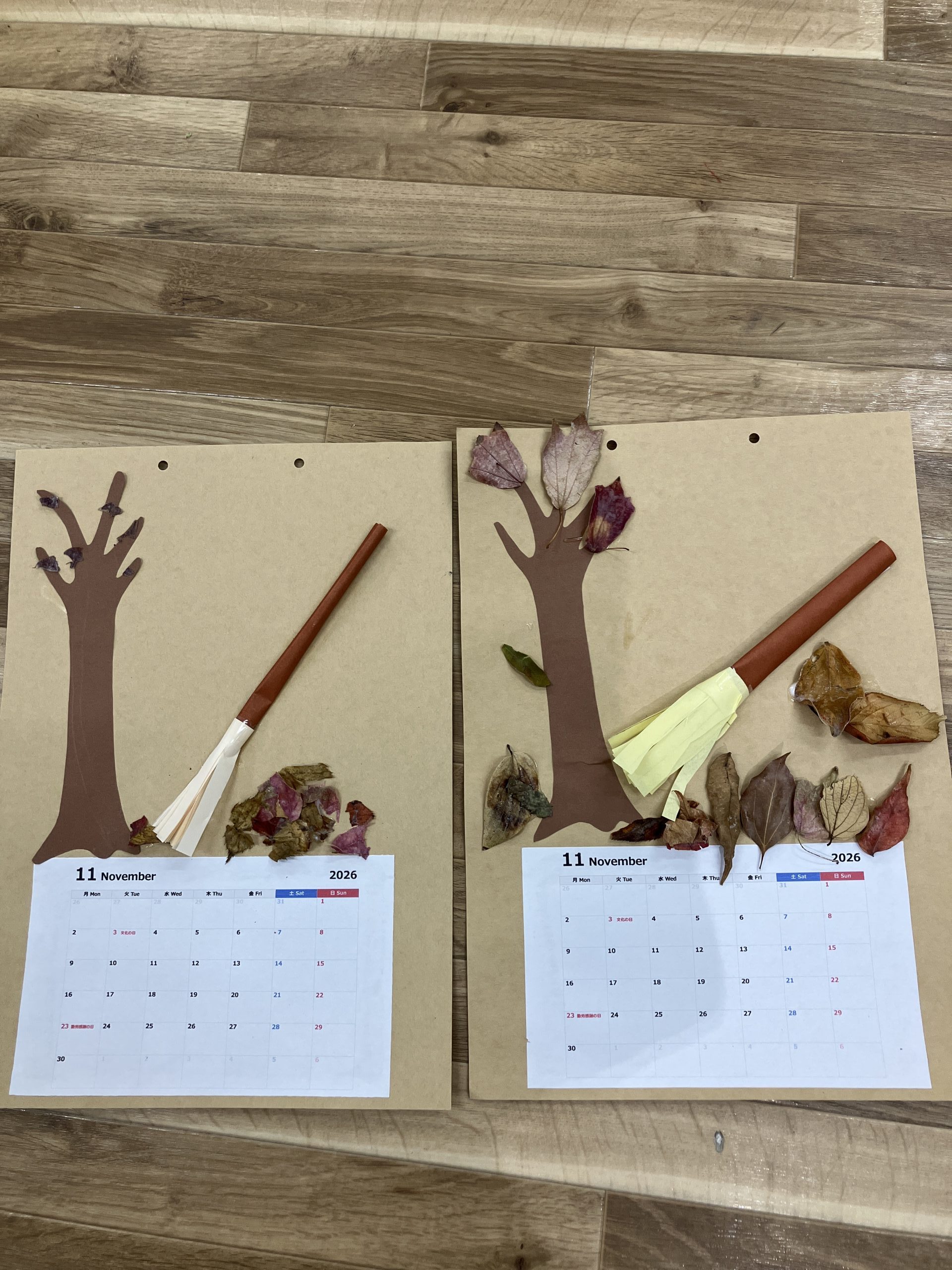 その後はのりで木の幹とほうきを画用紙に貼り付けていき、ほうきで掃くようなイメージの位置に本物の葉っぱをボンドで散りばめていきます。