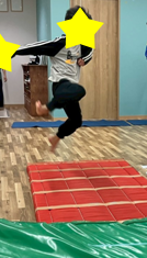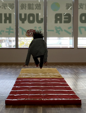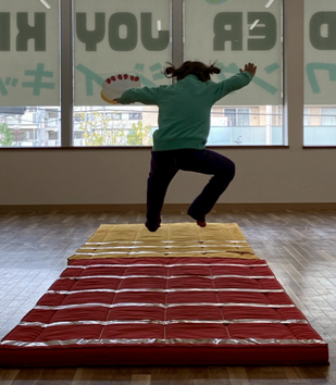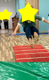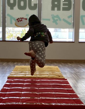 マットにひかれている線の遠くへ行けば行くほどもらえるイチゴが増えていき、より遠くへ飛ぶため勢いをつけて頑張ってくれていました😊