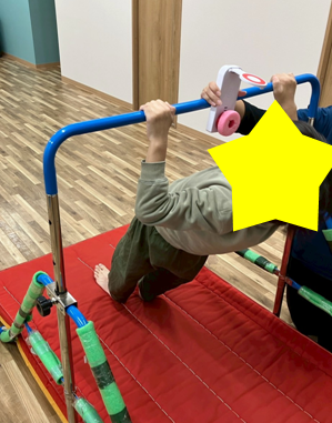 お腹を床につけた状態でスタッフによって移動する細長い棒を持ち、腕や手に力を入れて振り落とされないようにする活動や、実際に鉄棒を出して、斜め懸垂の要領で顎もしくはおでこで「ぴんぽん!」となるボタンを押したりなど、腕に力を入れて体を引き寄せる動きをたくさん行いました👏