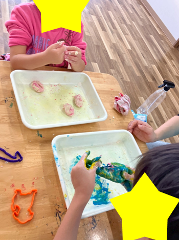 まとまった後は、ピザのように伸ばしたり、お団子をたくさん作ったり、色を付けたり、型で遊んだり・・