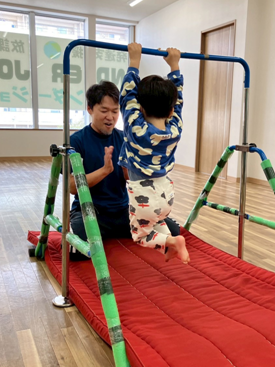 何度も繰り返し行うことで、体の動かし方や力の入れ方が少しずつ分かっていき、最後鉄棒を出してぶらさがったり、逆上がりの動きに繋がっていきました!