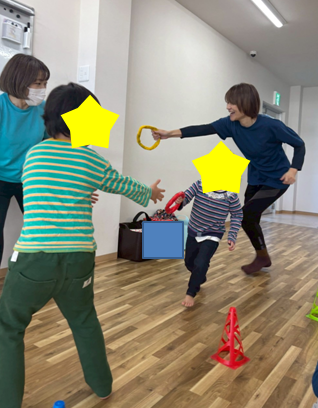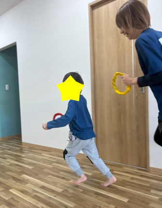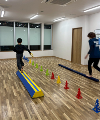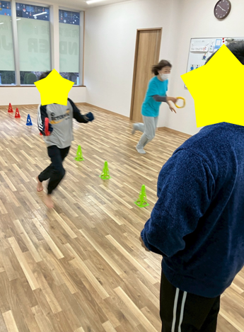まず児童発達支援の子どもたちは、療育スペースの真ん中に丸く置かれたコーンの周りを一周する形のリレーを実施!