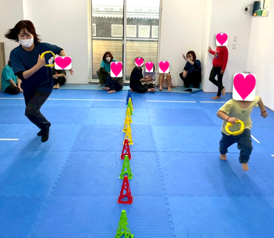 「よ~い、どん❕」でバトン渡しをスタートすると、始めはゆっくりバトンをお友だちに渡すだけでしたが、スタッフがスピードアップしてお友だちにバトンを渡すようにすると、子ども達も真似をして、バトンを渡す速度がアップ⤴