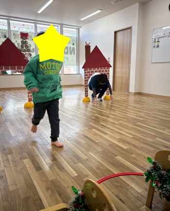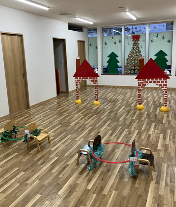 一人一つ飾りを持って、この障害物をよけながらゴールにあるツリーにつけて、次の人にバトンタッチ✋