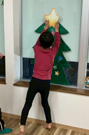 療育スペースに飾りのついていない2つのツリーを用意し、それぞれ子どもチームとスタッフチームに分かれて、飾りつけのスピードを競う活動を行いました!