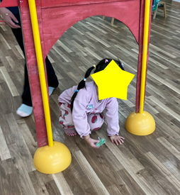 それぞれのコースには、またいで通るフープと、その先にくぐって通るお家を設置しました!