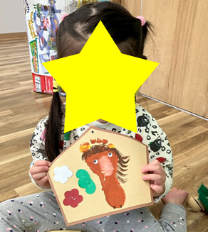 最初に足形を取ったのですが、絵の具を塗られる時のくすぐったさに子どもたちもなんだか楽しそうで・・😊