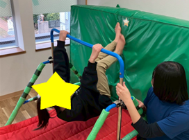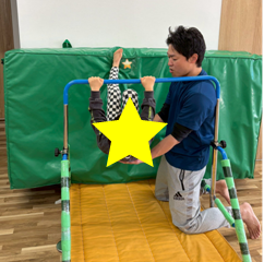 鉄棒と壁の間に🌟の目印をつけたエバーマットを置き、鉄棒をにぎりながら足は🌟を目指して登っていく。
