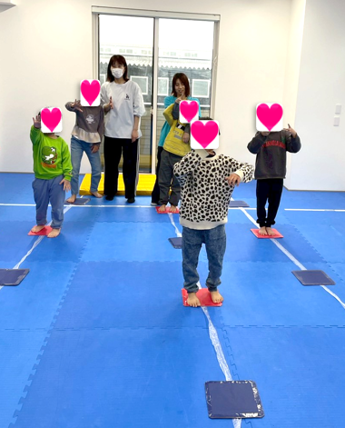 児童発達支援では、マットの島からマットの島へ渡る遊びをしていて、渡っている時にお邪魔虫が出てきて、そのお邪魔虫をじゃんけんの指定された手で倒す、という遊びをしました🐛