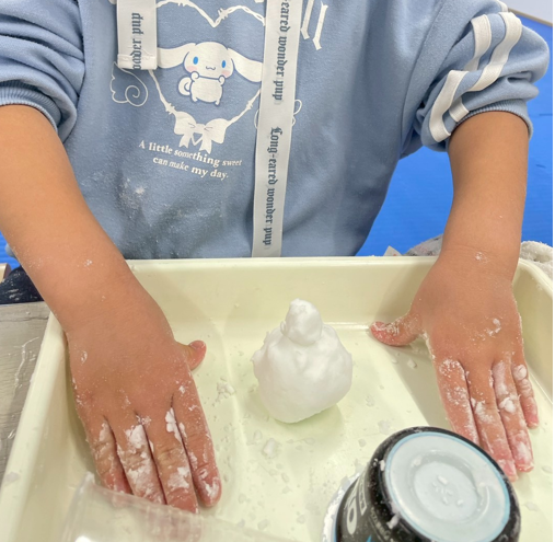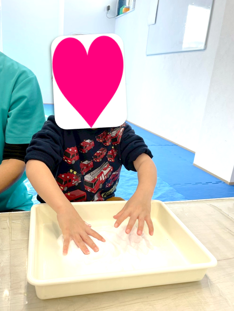 感触遊びでは、まずは重曹のみで触って遊んだのですが「これ雪なの❓」と不思議そうにしていて可愛らしかったです🤭