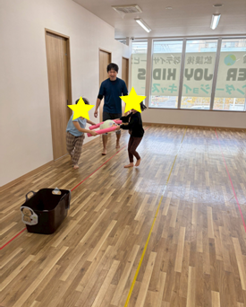 お友達と二人一組になり、「協力」しながら、力を”調節・加減”して、風船を目的地まで運ぶ運動に挑戦しました。