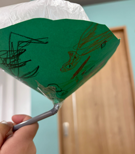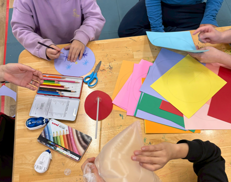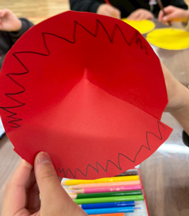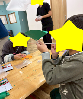 また、放課後デイサービスの子どもたちは、円錐にするときに描いた絵が隠れないようにくふうしたり。円錐にした時に一つの絵が完成するデザインを考えたり、風船に顔を描いたりと、それぞれのアイデアが光っていました✨