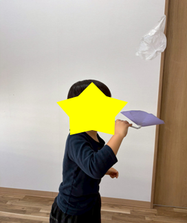 ストローから息を吹き込むと風船がふわっと浮かび上がります。それをタイミングよくキャッチ!できあがった作品で楽しく遊ぶ姿が微笑ましかったです。