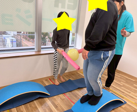 お友達の動き、挟んでいる風船、自分の足元。