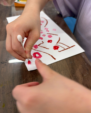 放課後等デイサービスの子どもたちは、綿棒で、ポンポンと5回スタンプして花びらを作ります。