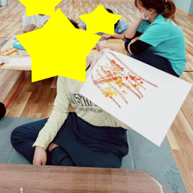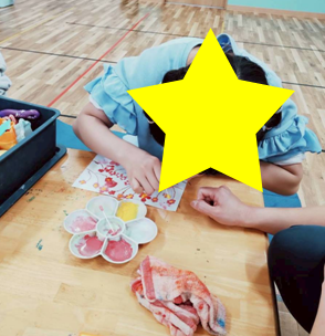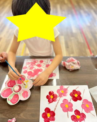 綿棒と、スポンジと、大きさは違いますが、どちらも、「5回ポンポン」で花びらを描いていく作業がなかなか難しく、位置や力加減に意識して、集中して取り組みました。